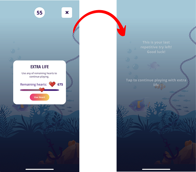Selecting “Use Heart” will consume one heart, allowing you to resume your game from the point of interruption, along with a notification of your remaining tries.
